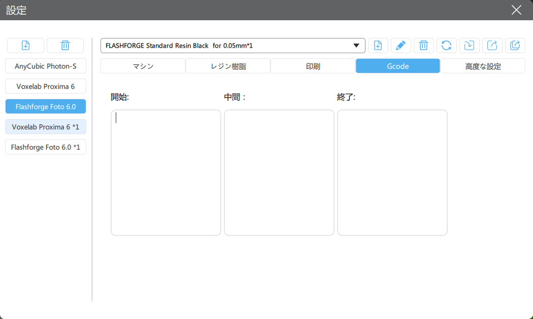 発生する不具合としましては、1.8.1時代に作成していたマシンプロファイルのGcodeの枠がすべて真っ白となっておりました。当方の場合、Photon-SとProximaとFoto6.0が1.8.1時代に作成したプロファイルなのですが3つともこの欄がすべて空白になってしまっていました。