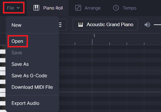 File左上のタブをクリックしてを選択し、ポップアップウィンドウでインポートしたいOpenMIDIファイル( )を選択します。*.mid
