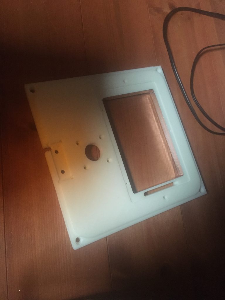当初上げ底方式で何とかクリアしてみようかと思っていたのですが、Anycubicの魔改造リンクを見て、取り合えずFDMでベースのプレートをつくってみました、PETGは材料持っていなかったのでABSで、でも白。