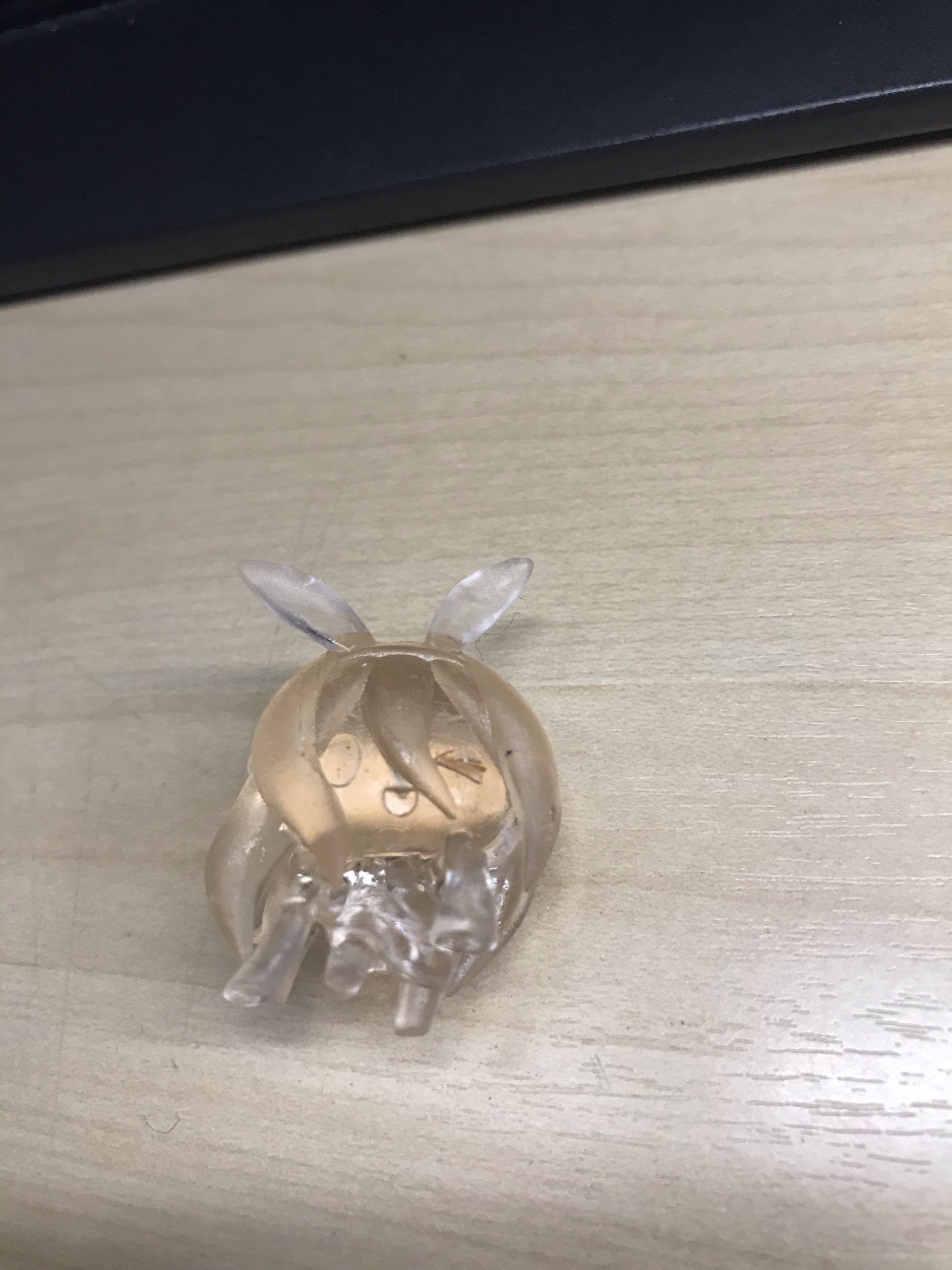 集光レンズとはいえ、アクリルレンズのため、透過率が低いことから、外した場合露光オーバーになったのでは無いかと思われます。試しに3秒露光でも造形してみたのですが、設定をミスってて、半分4秒、途中から3秒のショーコちゃんが出来上がりました、写真ではわかりづらいのですが髪の先と胴体部分が確実に色が変わっています