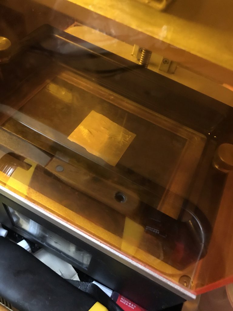 原始的にアルミテープで目張りです。試しにショーコ像を出力。NanoDLPの場合はデフォルト設定のままアップロードすると自動的に真ん中に調整されてしまうので、オリジナルセンターにする必要がありました。この設定を無効にしてしまうと、うまくスライスできず出力できません。