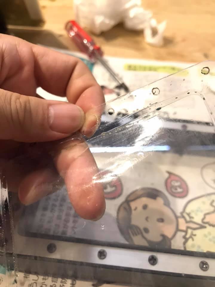 すべて外して、取り外し。不思議だったのは新しいFEPフィルムには穴が開いてないんですよね。でもねじを入れると普通に締めていけるので、FEPフィルムってものすごくもろい素材のようです。