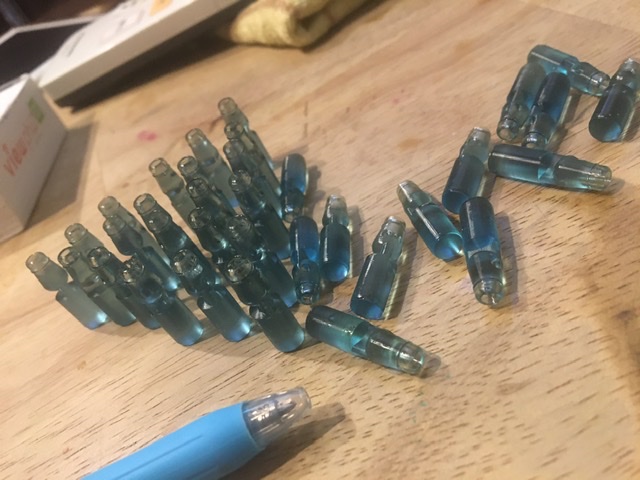 この例ではELEGOOさんのスタンダードレジンのクリアにシアンを適量混ぜただけなのですが、うっすらと青いラムネ特有の緑がかった青がうまく再現できたのでは無いかと思います。何故青しか入れてないのに緑なのか?となるかもしれませんが、レジンって二次硬化を進めるとどんどん黄色くなるので、それうなることを踏まえて最初から想定が必要です。微妙な色を最初から思った色で出すのは難しいですので、こんなこともできるよっていう裏技ですね。あとはテスト出力しながら徐々に好みの色に調節していくという地道な方法をとっています。