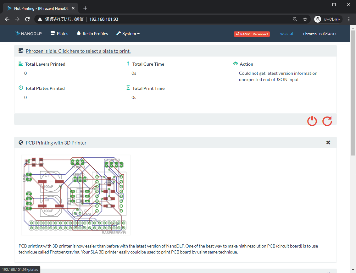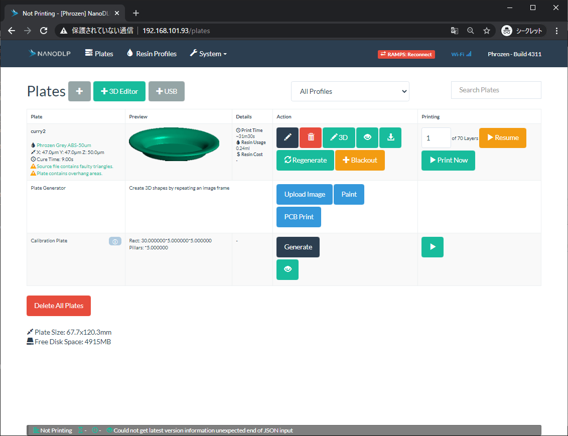 まずはメイン画面から、nanoDLPのV3系のデフォルト画面にしてあります。ここからZキャリブレーションやLCDの動作テストもできるので便利です。
