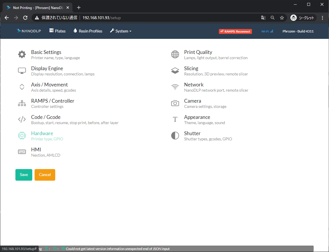 今までPhrozen版では隠されていたメニューが多かったので、設定画面が一番大きく変わっていますね。現状はNanoDLPストックでアップデートしてしまったので、ロゴとかもすべてnanoDLPに戻っております。このあたりはPhrozenのロゴに戻してしまってもいいのかなぁ(著作権がらみがあるのでこのままかもしれません。)